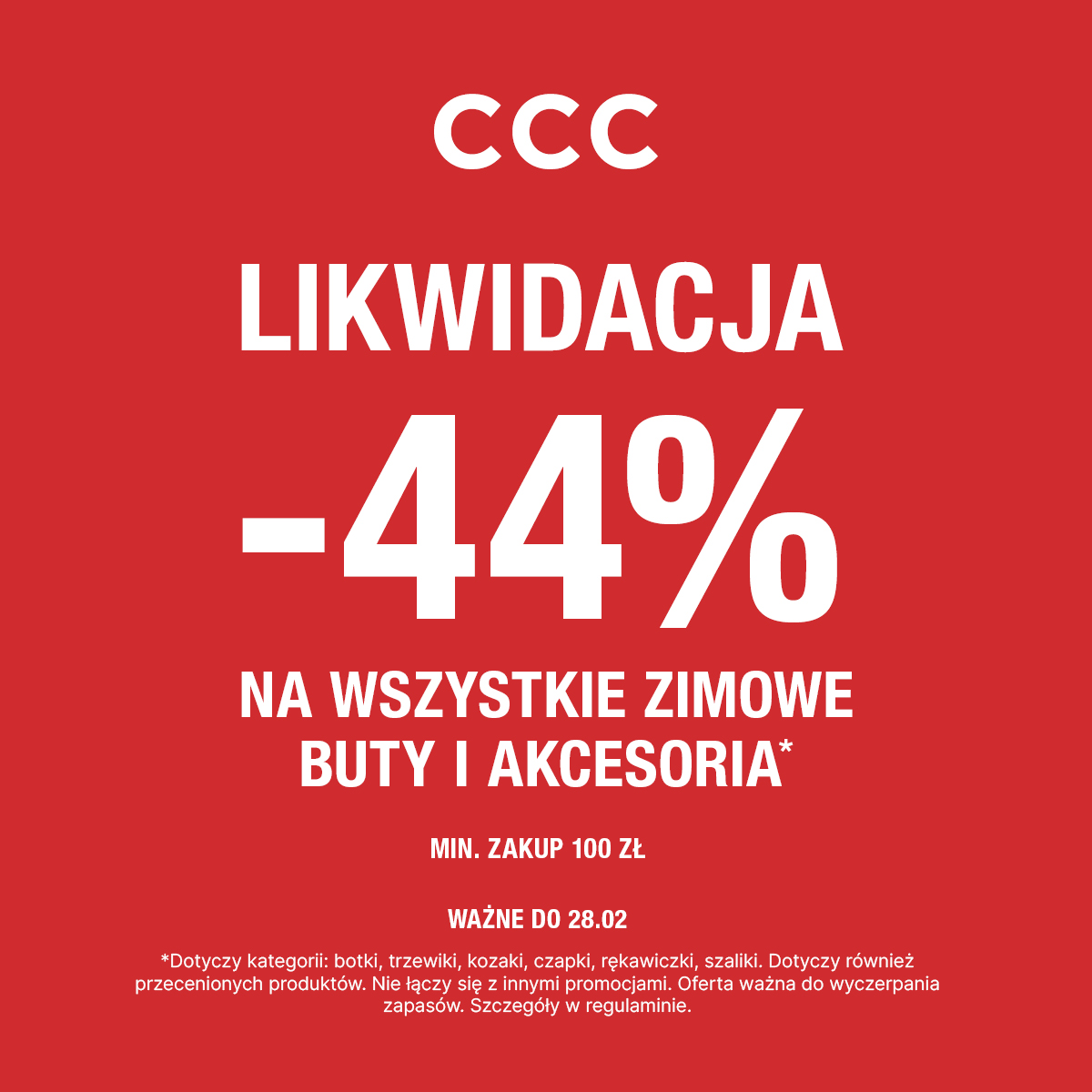 Likwidacja zimowej kolekcji w CCC! -44% na wszystkie botki, kozaki, trzewiki i akcesoria - także już przecenione! Zrób zakupy za minimum 100 zł i zyskaj rabat 44% na zimowe buty i akcesoria. Oferta ważna do 28 lutego lub do wyczerpaniazapasów. Szczegóły w regulaminie.