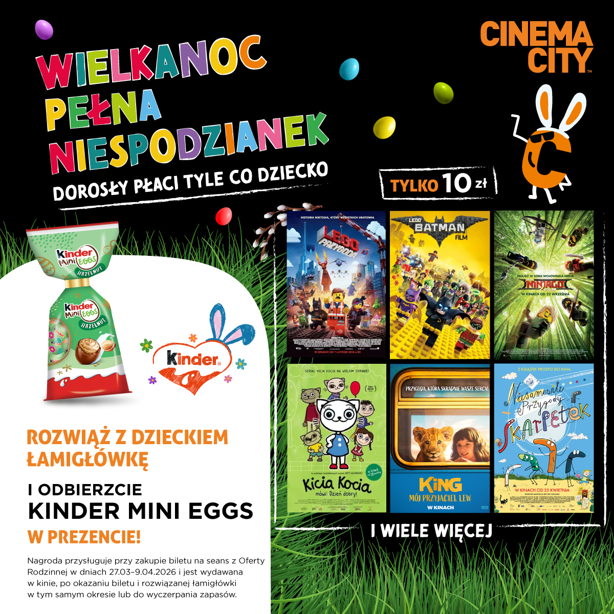 Ci, którzy kupią bilety na seanse w ramach Oferty Rodzinnej w dniach 27.03-09.04.2026 i poprawnie rozwiążą dostępne w kinach łamigłówki dla dzieci, otrzymają słodką niespodziankę od Kinder w prezencie. Łamigłówki dostępne są w dwóch wersjach – wykreślanka dla starszych dzieci lub prosty labirynt dla młodszych kinomanów. Po ich poprawnym rozwiązaniu i po okazaniu pracownikowi kina wraz z biletem na film z Oferty Rodzinnej, będzie można odebrać w każdym kinie Cinema City czekoladki Kinder Mini Eggs. Warto jedynie pamiętać, że jeden bilet na film z Oferty Rodzinnej to jedna paczka słodkiej niespodzianki od Kinder. Akcja potrwa od 27 marca do 9 kwietnia lub do wyczerpania zapasów czekoladek.